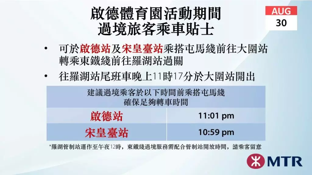 另外,過境旅客可於啟德或宋皇臺站乘搭屯馬綫前往大圍站,轉乘東鐵綫前往羅湖站過關。羅湖管制站運作至午夜12時,前往羅湖站的東鐵綫列車服務需配合相關開放時間。港鐵提醒旅客留意相關尾班車時間,提早計劃行程及預留足夠轉車時間。