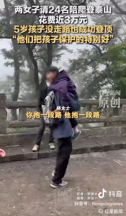 同行的楊姓女子表示,自己帶同年僅5歲多的孩子與朋友相約挑戰泰山。2人各自聘請12名陪爬人員,連同住宿等支出,總費用接近3萬元人民幣。她大讚陪爬人員十分專業,「從泰山最下面就抱著我的孩子,你抱一段路,他抱一段路,讓孩子沒走路也成功登頂,把小孩子保護得特別好」,山上冷甚至把衣服脫下來給孩子穿,因此孩子的體驗感非常好。