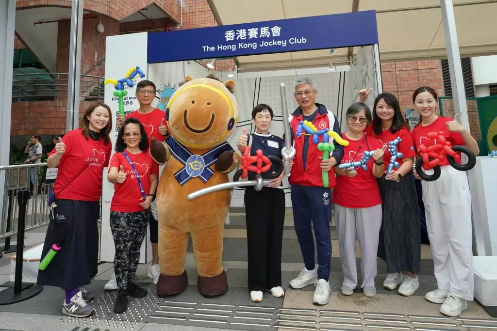 馬會今日在沙田大會堂廣場舉行的「2025全運大派對」設展區,文化體育及旅遊局副局長劉震(右四)與馬會義工隊成員及馬會吉祥物JC隊長合照。