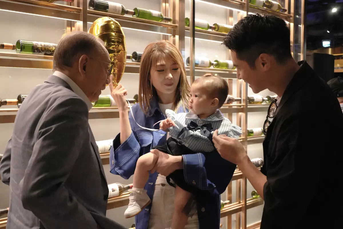 講到全場最搶Fo,絕對是陳家樂囡囡Camila!家樂除了帶埋太太連詩雅(Shiga)現身,仲抱埋剛剛一歲的囡囡女Camila一齊出席,這位「七月BB」第一次參加公司生日會,眼仔碌碌四圍望,對着閃閃氣球顯得超好奇,萌爆程度即刻秒殺全場。她不單止成為眾人焦點,連英皇集團主席楊受成都忍不住走過去逗她玩。楊受成見萌B立刻封了大利是給Camila,寓意福氣滿滿!而Camila亦即時「回禮」錫咗楊受成一啖,甜到漏,看來這位「七月之星」已經成功俘虜楊博士的心。