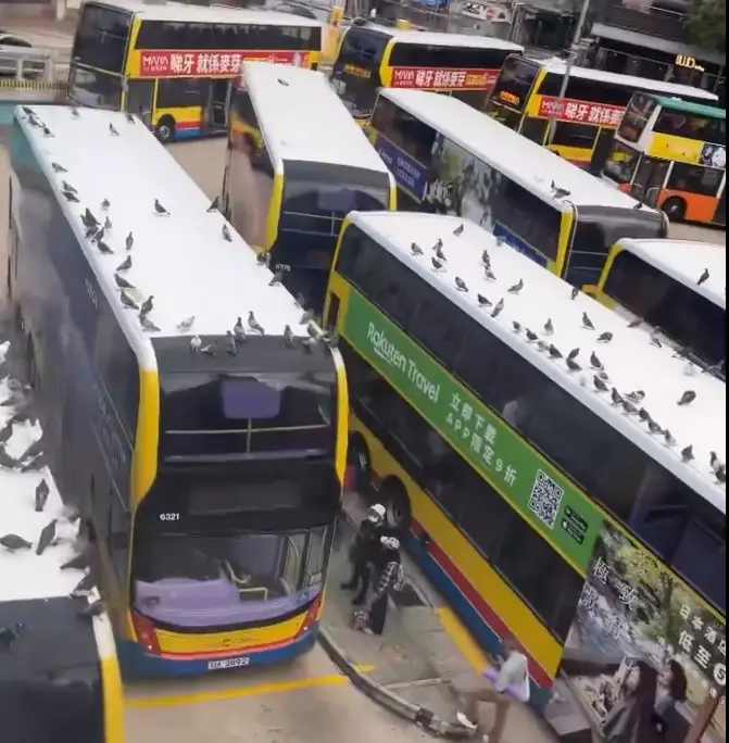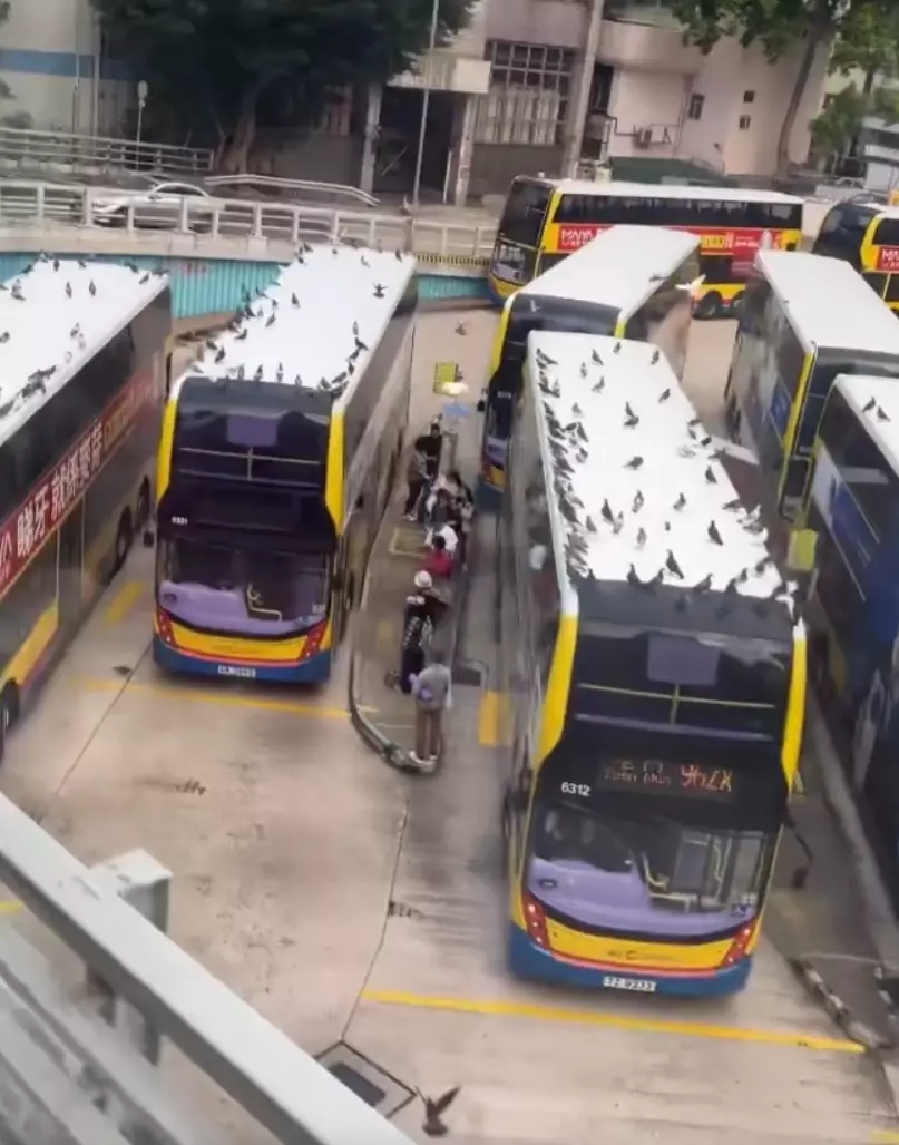由片段所見,摩頓台巴士總站的巴士車頂滿佈野鴿,密密麻麻,場面誇張,猶如大型白鴿派對,有網民留言形容是「古菇固gathering」、「巴士車頂好多嘢食啊」、「伴隨鴿屎成車頂都係」、「門堪羅雀」,有人質疑到底司機知唔知道情況「有沒有通知司機?」。