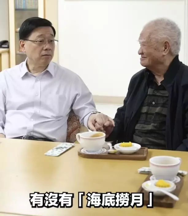 李家超今日於其fb發影片,只見伯伯一手握實李家超的左手,與他聊天。特首話,「我真的很高興,你106歲,還這麼精神,聲如洪鐘。」兩人談談笑笑,及後又聊到打麻雀將,特首問起老伯打什麼規則,老伯答話:「兩番起糊…打花....平糊.....」特首追問「有無海底撈月?」老伯答「無」。特首再問:「摸晒定摸和?」老伯話「摸晒」。特首就話「摸晒係高手喎」。