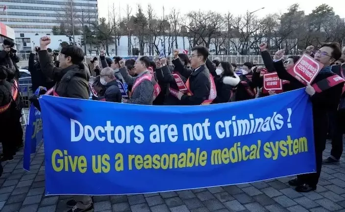 南韓醫學界工潮在去年初開始,時任總統尹錫悅提出,大幅增加醫學院招生以滿足國內醫療需求,做法遭到醫學界強烈反對,過萬名實習醫生罷工。AP資料圖片