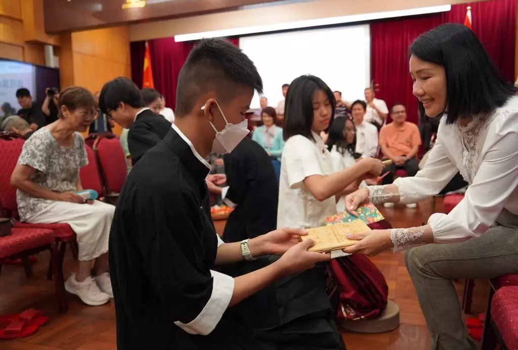 活動現場,孩子們與父母一同參與了包括三跪父母感謝養育之恩、親子互贈禮物、父母為孩子穿戴儀服及簪紅花等程序。最引人注目的是父母牽引孩子跳出花園的環節,象徵著孩子們正式步入成人階段。主禮嘉賓為孩子們簪上竹葉襟花,這一細節蘊含深意,潮語中「竹」與「德」同音,竹葉襟花不僅代表嘉賓對孩子的肯定,更象徵著美德的傳承。