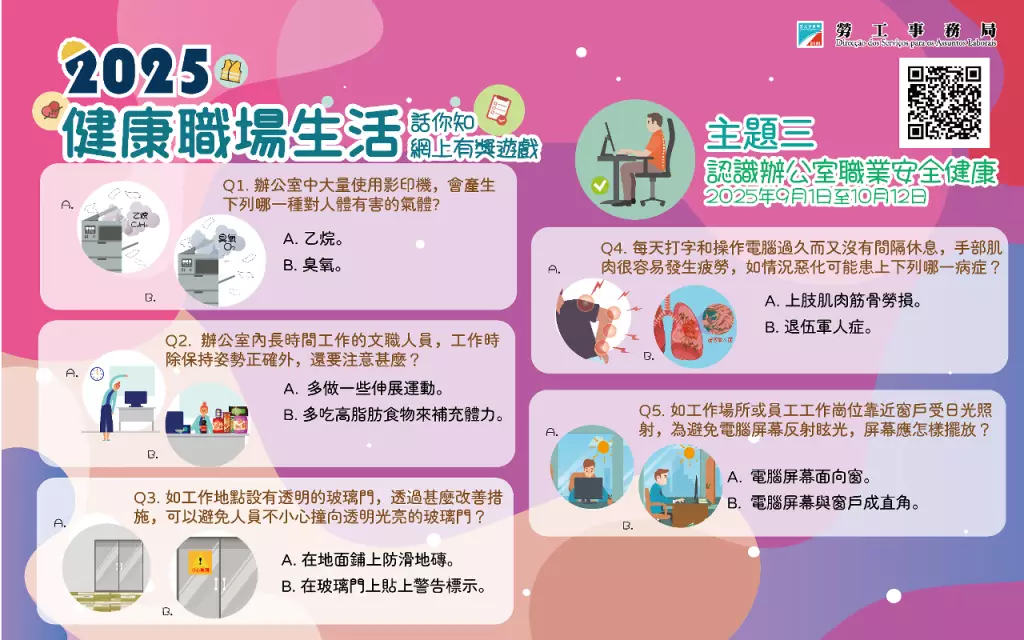 為持續提升市民對職業健康的關注,勞工局由9月1日起至10月12日期間推出第三期職業健康有奬遊戲,主題為「認識辦公室職業安全健康」。歡迎有興趣的市民可透過勞工事務局手機應用程式或掃描二維碼參與。