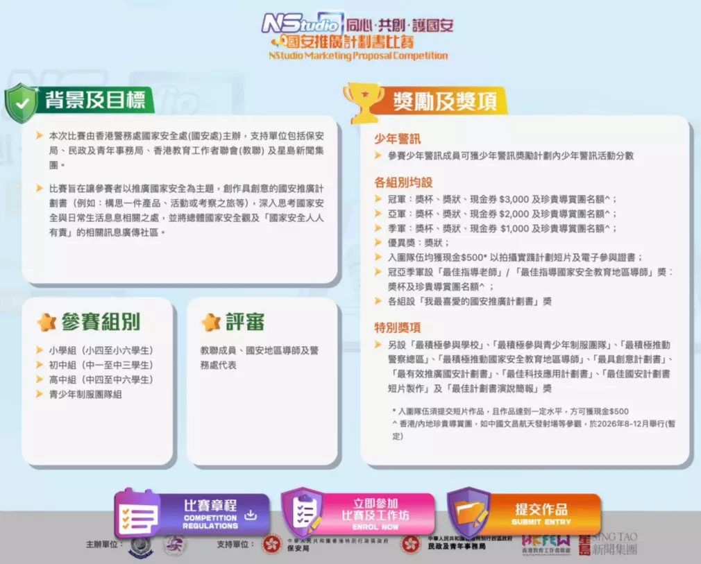 警方推出首屆「NStudio 國安推廣計劃書比賽」,邀請中小學及青少年團隊提交創意推廣方案,報名截至1月25日。
