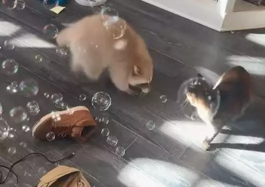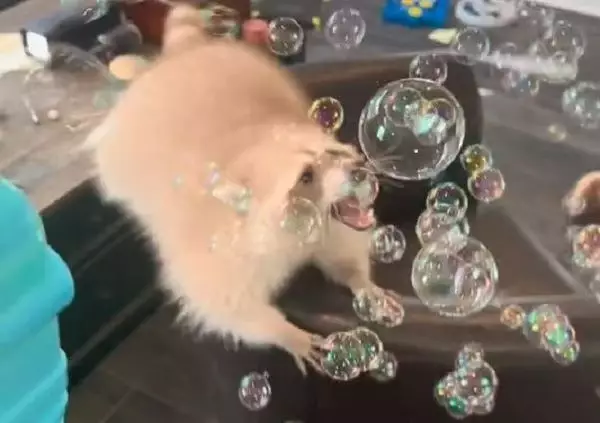 可愛浣熊首次玩泡泡超好奇,興奮穿梭全屋追逐並揮小手猛抓,萌爆全網。