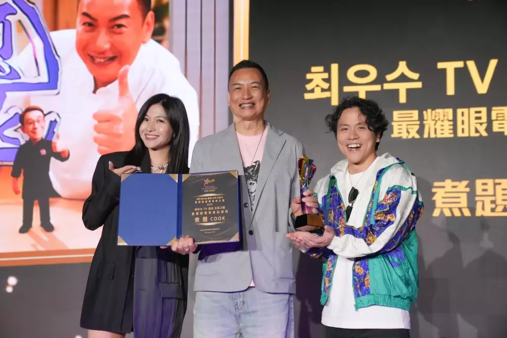 得到「最耀眼全方位男藝人」的黃浩然坦言上次攞獎已是好耐歷史的事,「有獎 攞梗係開心,但我老婆開心過我,因為佢好鍾意睇韓國愛情劇,成日話我畀唔到 浪漫感覺佢,全靠韓劇搵返呢份浪漫。對於全方位藝人,講真我以前都好悶,係 個幾單向嘅藝人,咩都唔敢試,直至我有咗兩個囝囝,加上太太鼓勵我試多啲新 嘢,加上自己年紀都唔細,再唔試就冇乜時間再試,所以呢幾年我試咗好多唔同 嘅嘢,愈係難愈係覺得自己做唔到嘅嘢,我就愈去挑戰,譬如唱歌同跳舞,本身 呢啲都係弱項,嚟緊我都想挑戰吓啲動作嘢,都會學吓功夫,再挑戰最弱嘅嘢, 畀多啲唔同面向觀眾睇,自己有新鮮感之餘,都可以帶到多啲新鮮感畀觀眾。」 獲得「最耀眼全方位女藝人」的蔣怡就搵到同黃浩然同奪獎的共通點,「聽到『最 耀眼全方位男藝人』黃浩然喺台上感言,我突然發覺要成為全方位藝人係需要幾 個條件,第一就係要模特兒出身,第二就係結咗婚生咗小朋友,佢有個好好嘅太 太,我有個好好嘅先生,我當初做模特兒嘅時候,覺得自己唔係好適合做模特兒, 因我實在太鍾意食嘢,感覺做模特兒好似冇乜前途,後來好幸運去追求自己好鍾 意做嘅嘢,去學煮嘢,再有機會將學到嘅嘢有機會發揮出嚟,感謝我身邊有好多 好好嘅朋友、同事同團隊畀咗個好好嘅平台,畀我可以發揮出嚟,希望我可以煮 多啲好嘢畀屋企人食,做多啲好睇嘅美食節目畀大家欣賞。」
