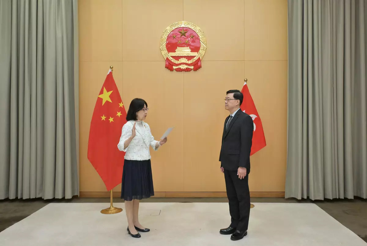 個人資料私隱專員鍾麗玲在行政長官李家超監誓下作出誓言,宣誓擁護《中華人民共和國香港特別行政區基本法》,效忠中華人民共和國香港特別行政區,盡忠職守,遵守法律,廉潔奉公,為香港特別行政區服務。
