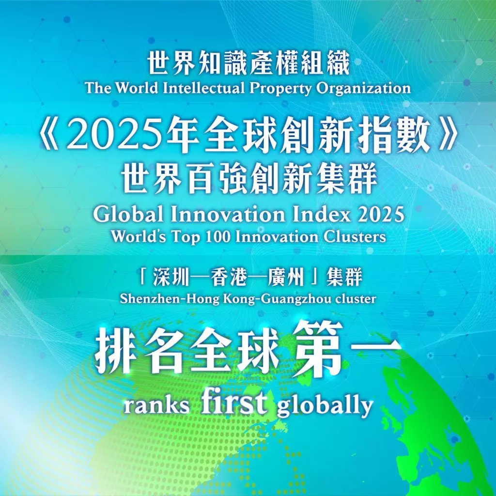 世界知識產權組織發布《全球創新指數》世界百強創新集群排名,「深圳—香港—廣州」集群排名由過去五年的第二位升至全球第一。本地多間大學表示祝賀。