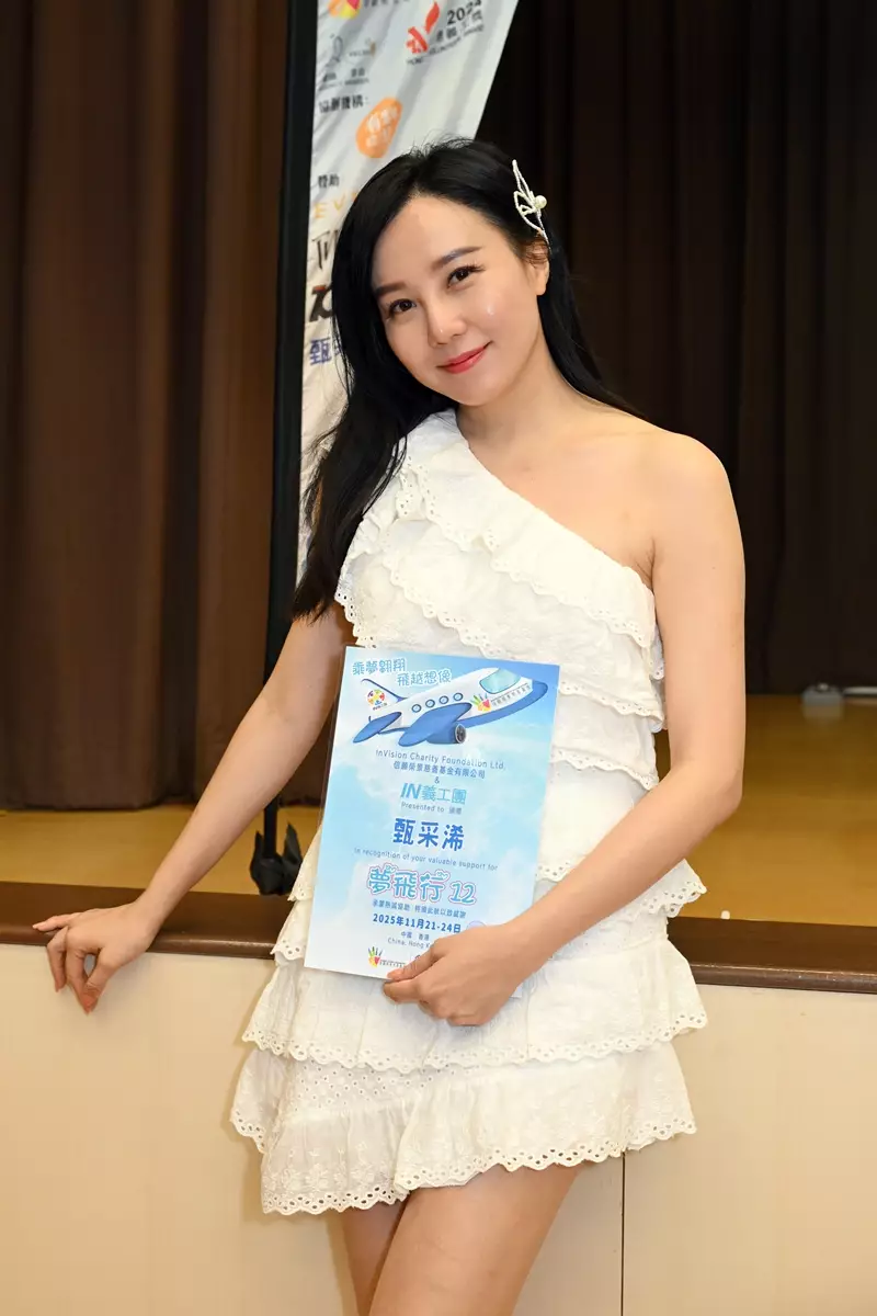 甄采浠昨日亦在「夢飛行12」的活動啟動禮上,以活動贊助之一上台領感謝狀,原來她私人亦捐善款支持今次活動,剛好昨日是其正日生日,上台時,全場向她送上生日祝福。甄采浠表示:「我也是第一次做今次活動贊助,曾經做過活動大使,所以令我好感動,這次只是小小心意,希望可以幫助到更加多的家庭和小朋友,期待每一年自己都有能力盡小小心意。(覺得社會應該多些關注?)一定要,因為自己是身同感受,我患有讀寫障礙,一行字也要睇三次,很多內向型小朋友不懂表達,有些家長以為頑皮,加上要賺錢養家難以兼顧,希望外界多些關心身邊人。」