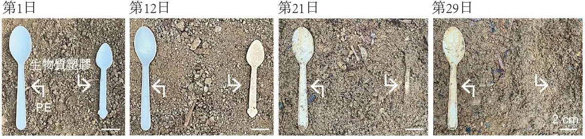 團隊研發的「新型物料」(圖中右邊的匙羹)以源自天然植物基因的分子結構設計而成。實驗結果顯示,當它與圖中左邊以聚乙烯(Polyethylene, PE)製成的匙羹一同埋入一般土壤中,「新型物料」可在最短 29 天內完成降解。