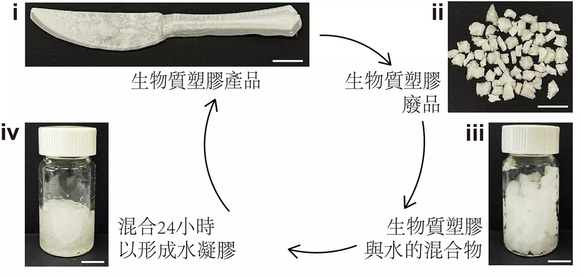 新型環保生物塑膠物料回收後浸入水中,經過一定時間會逐漸軟化成水凝膠狀態,循環再造成其他塑膠品。