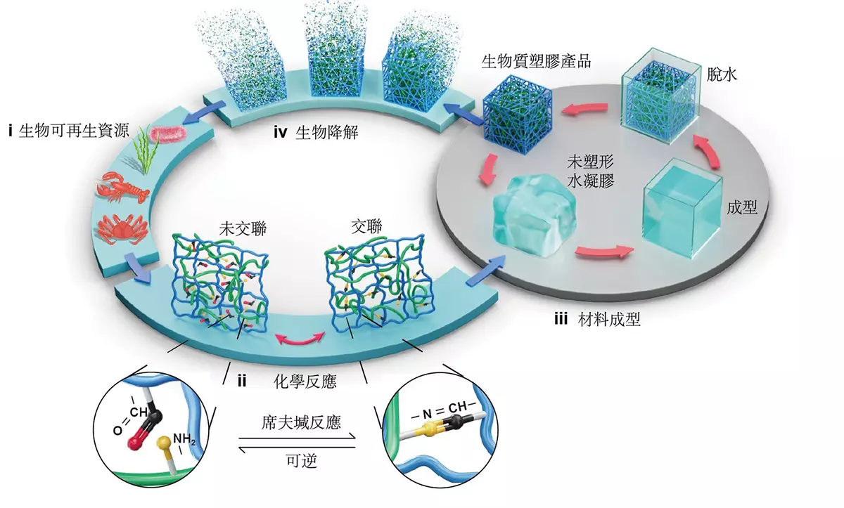 研究團隊包括嶺大跨學科學院院長及跨學科講座教授陳曦教授,以及跨學科學院助理教授柯宇杰教授(論文第一作者),他們聯同美國北卡羅來納州立大學、以色列希伯來大學、新加坡科技研究局、新加坡南洋理工大學、新加坡國立大學、新加坡科技與設計大學等專家學者,聯合開發一種新型環保生物塑膠⸺可降解、可循環再造,採用多醣及源自天然植物和生物廢棄物的基因分子結構設計而成。與一般塑膠的耐用性相若,新型環保生物塑膠除了防水,亦可加工製成堅固的膠片或膠粒。