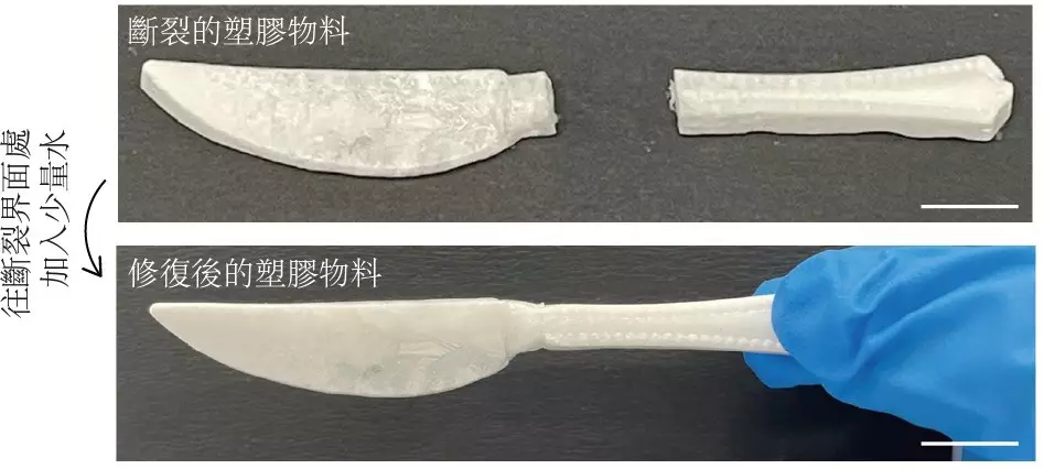 新型環保塑膠物料具有「自我修復」功能,實驗證實,若物料表面遇到輕微破損,只要於常溫下在裂縫或刮痕加入少量水,其化學結構能夠重新結合,恢復原來的分子結構及承載能力。
