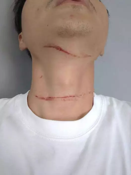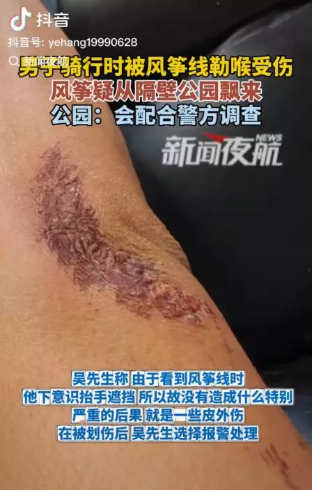 男子騎車出行遭風箏線「勒頸」摔倒,手背及頸部多處被割傷。影片截圖