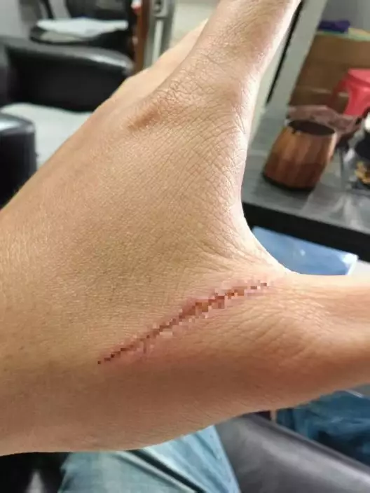 照片可見,吳先生左手背與頸部留有明顯線狀傷痕。他解釋,風箏線一端掛於貨運大樓樓板約6米高處,另一端則掛在靠洪湖西路的圍牆約3米高,形成「U形」下垂,自己行經較低位置時被劃傷。