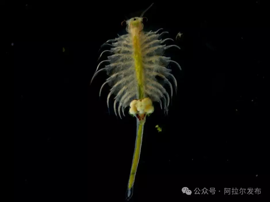 近日,塔里木大學生命科學與技術學院王智超教授團隊進行野生動物監測過程時,於新疆塔克拉瑪干沙漠邊緣三團甘泉鎮轄區一處野生動物飲水點意外發現「鹽水豐年蝦」的蹤跡。鹽水豐年蝦又稱「鹵蟲」,是地球上現存最古老物種之一,生存歷史可追溯至約4億年前,具備極強耐鹽特性。休眠卵能在乾燥無氧環境下保存多年,一旦遇水即可於一天內迅速孵化成幼蟲。