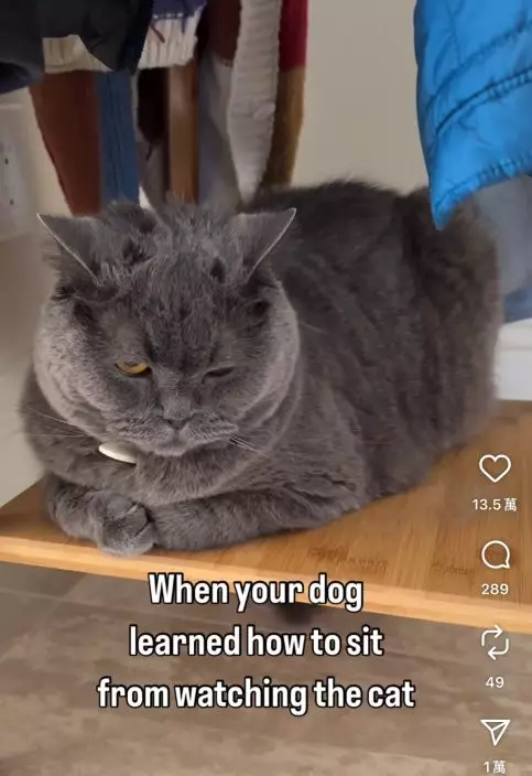 影片可見,藍貓正以「折手手」姿勢趴在衣架上休息,一旁的邊境牧羊犬見狀則仔細模仿,將前掌整齊收在身體下,姿勢與灰貓如出一轍,令飼主忍不住笑言:「當你的狗要靠貓才學會要如何坐著,其實牠的內在應該是一隻貓吧」。