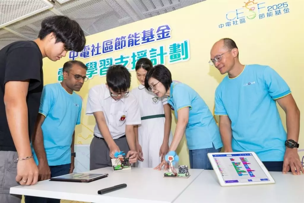 中華電力企業發展總裁莊偉茵(右二)聯同中電義工協助受惠學生運用全新 ipad 編寫程式,製作智能風扇,學習以科技慳電節能。