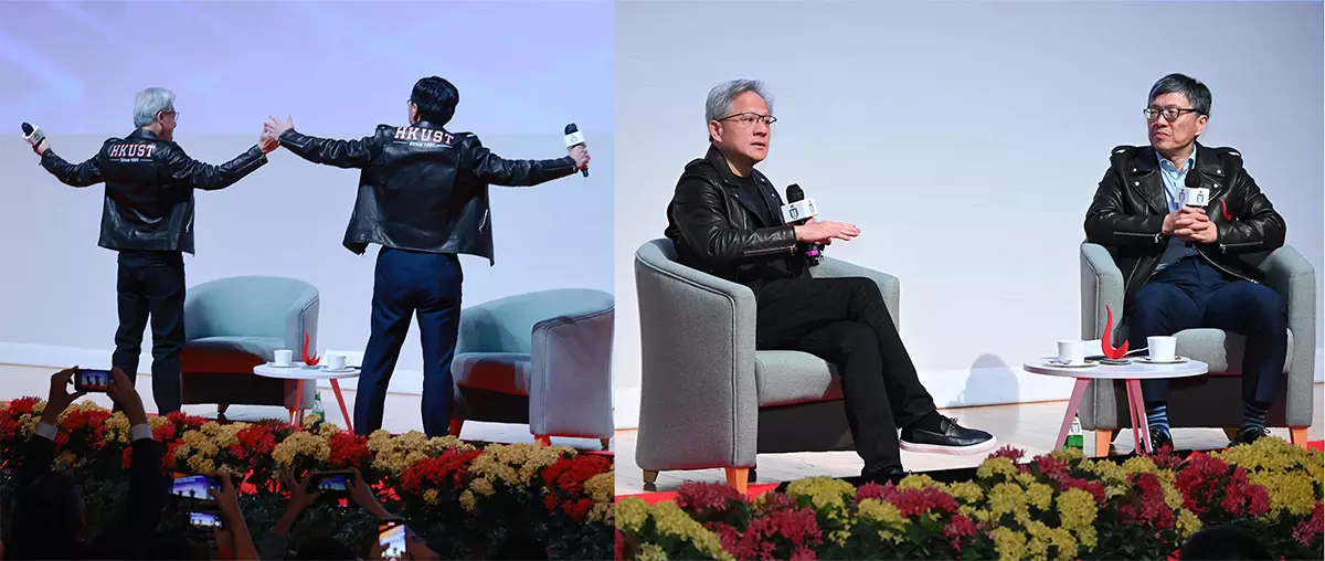 這件繡有「HKUST」字樣的標誌性皮衣,是黃仁勳於2024年11月獲科大頒發榮譽工程學博士學位後,在與沈向洋教授進行的爐邊對話環節中穿著。