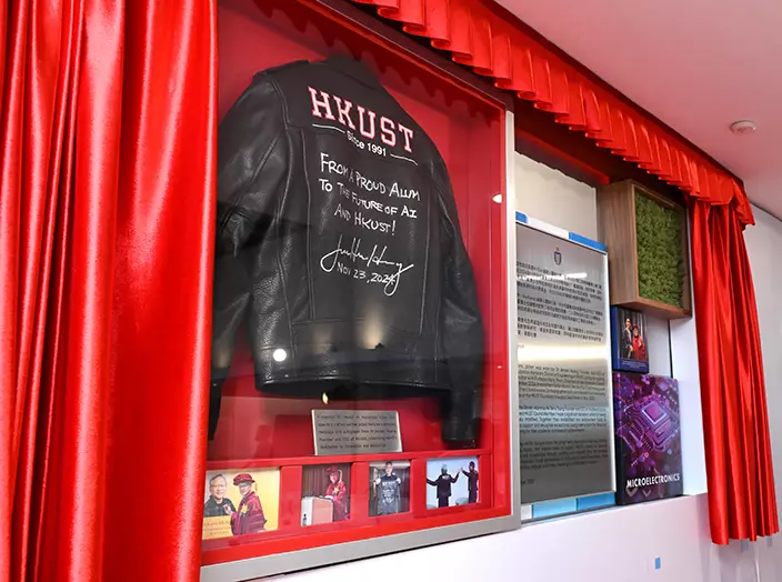 這件皮衣是黃博士2024年贈予科大的禮物,作籌款用途。皮衣上刻有「一位以科大為傲的校友獻給科大與人工智能的未來(From a proud alum to the future of AI and HKUST)」的字句,科大工學院作為國際排名領先的香港頂尖工程學院,將運用所籌得的捐款設立兩項年度獎學金: