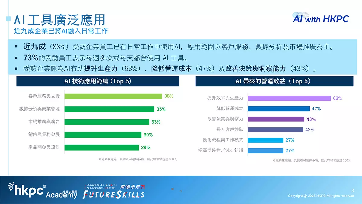 AI工具廣泛應用:近九成(88%)受訪企業員工已在日常工作中使用AI工具,應用範圍以客戶服務、數據分析及市場推廣為主。