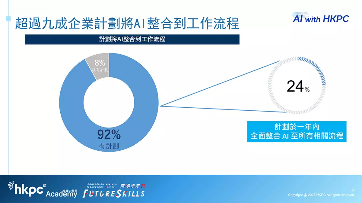 融入AI至正式工作流程:超過九成(92%)受訪企業計劃於未來逐步引入AI至相關工作流程,其中24% 計劃在一年內全面引入,顯示推動意願強烈。