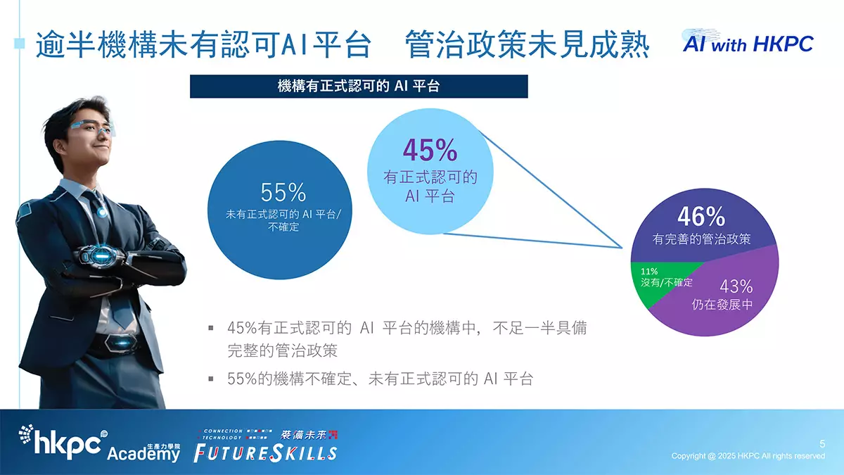 制度與治理框架建設:超過四成(45%)受訪企業已設有正式認可的AI平台供員工使用,當中超過一半(54%)表示暫時沒有完善AI治理政策。
