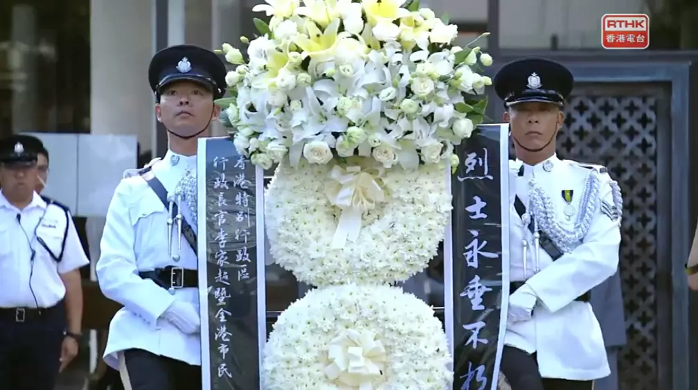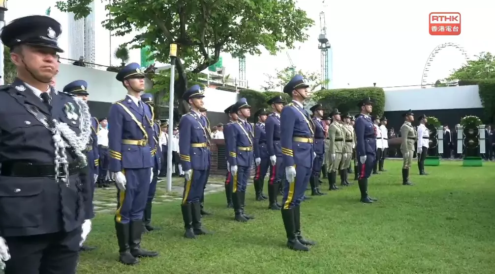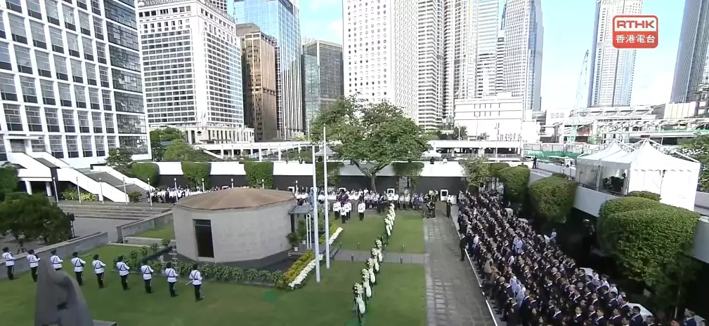署理行政長官陳國基和政府高層官員等出席在香港大會堂紀念花園舉行的官方儀式。港台直播影片截圖