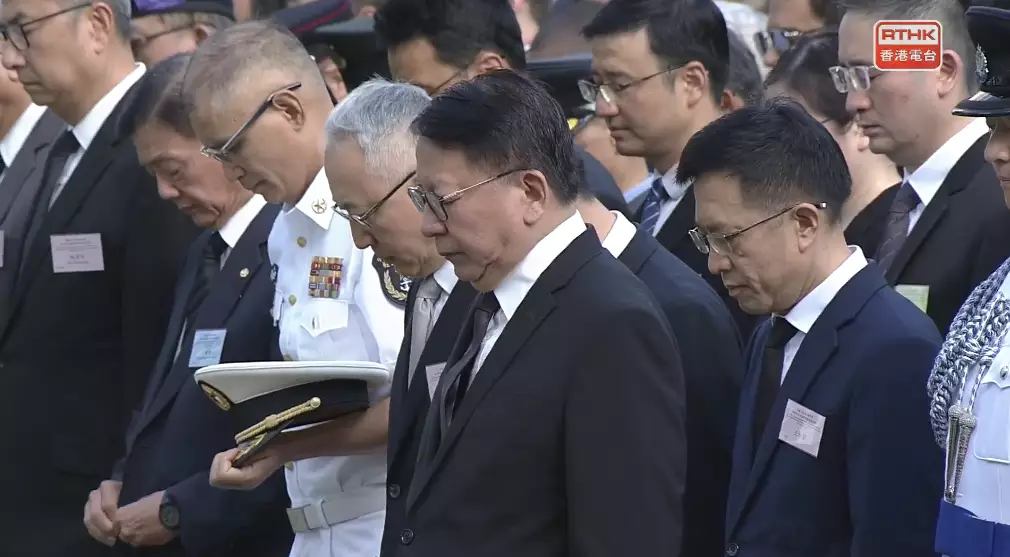 署理行政長官陳國基和政府高層官員等出席在香港大會堂紀念花園舉行的官方儀式,紀念中國人民抗日戰爭暨世界反法西斯戰爭勝利80周年。