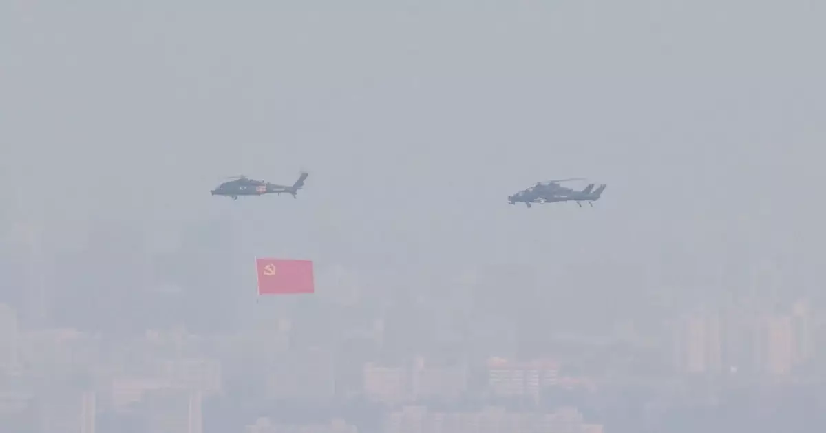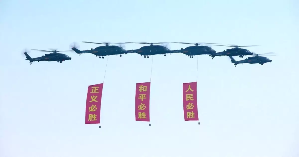空中護旗梯隊懸掛起黨旗、國旗和軍旗,以及分別寫有「正義必勝」、「和平必勝」、「人民必勝」的紅旗,組成「80」字樣陣式,飛越天安門廣場上空。