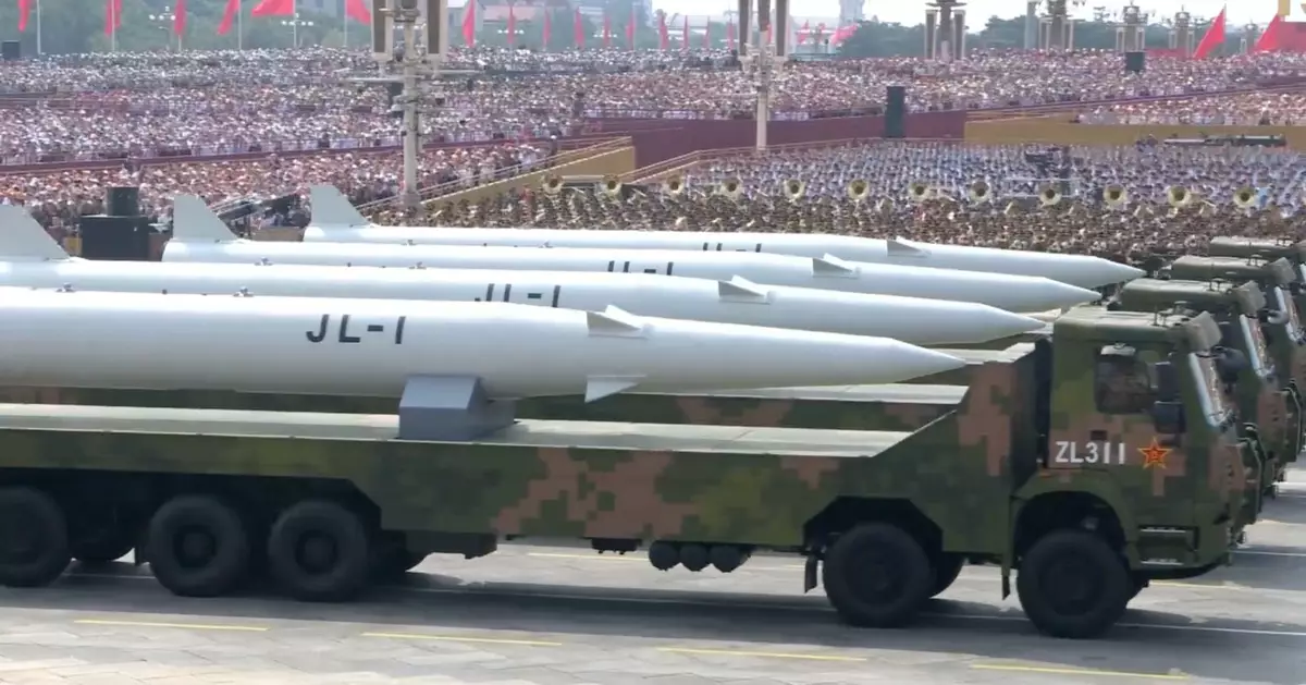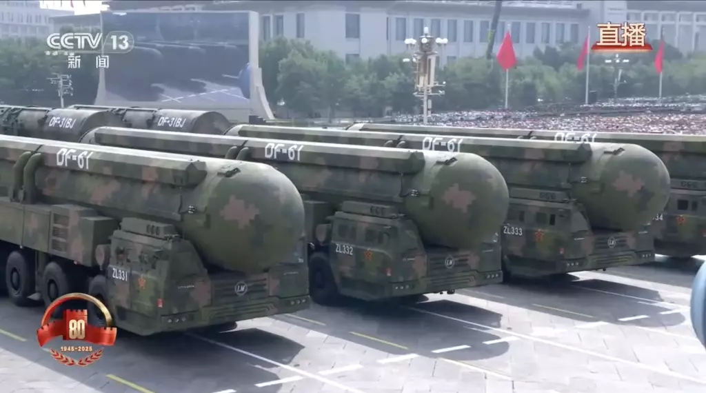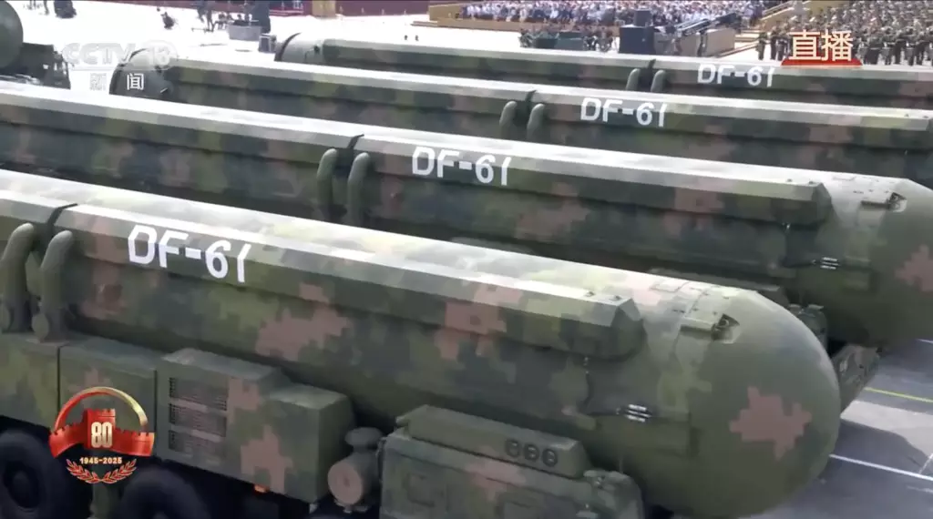 「九三閱兵」核導彈第一方隊震撼登場。「驚雷-1」空基遠程導彈、「巨浪-3」潛射洲際導彈、「東風-61」陸基洲際導彈、「東風-31」新型陸基洲際導彈受閱,首次集中展示解放軍陸、海、空基「三位一體」戰略核力量。