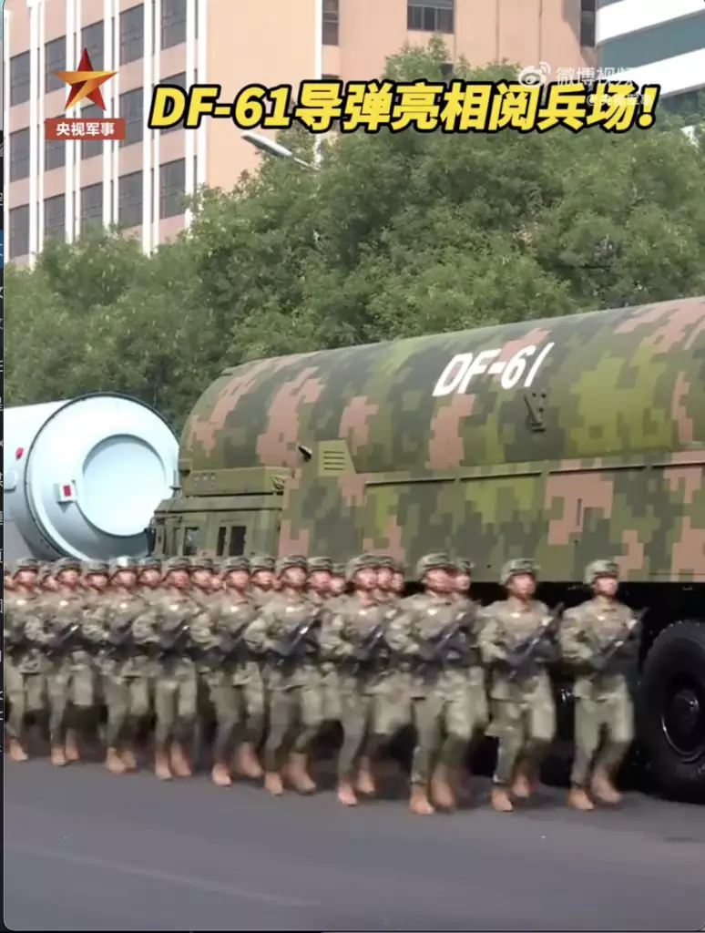 受閱的「驚雷-1」空基遠程導彈、「巨浪-3」潛射洲際導彈、「東風-61」陸基洲際導彈、「東風-31」新型陸基洲際導彈,首次集中展示中國解放軍陸、海、空基「三位一體」戰略核力量,是維護國家主權、捍衛民族尊嚴的戰略「王牌」。