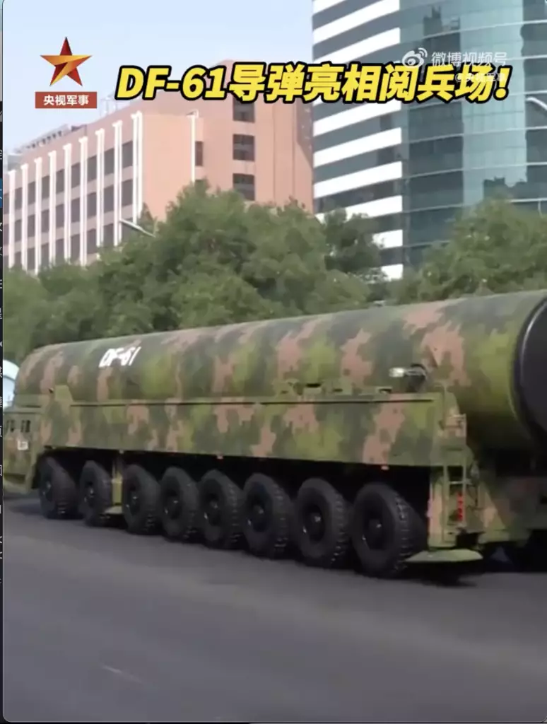 雄壯的軍樂聲中,習近平乘車沿着寬闊的長安街,依次檢閱徒步方隊和裝備方隊,DF61導彈亮相閱兵場。