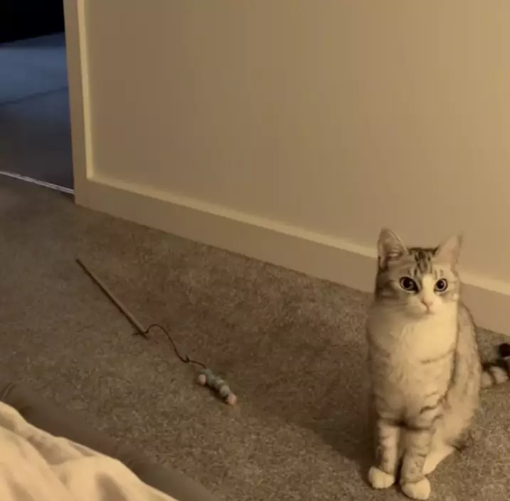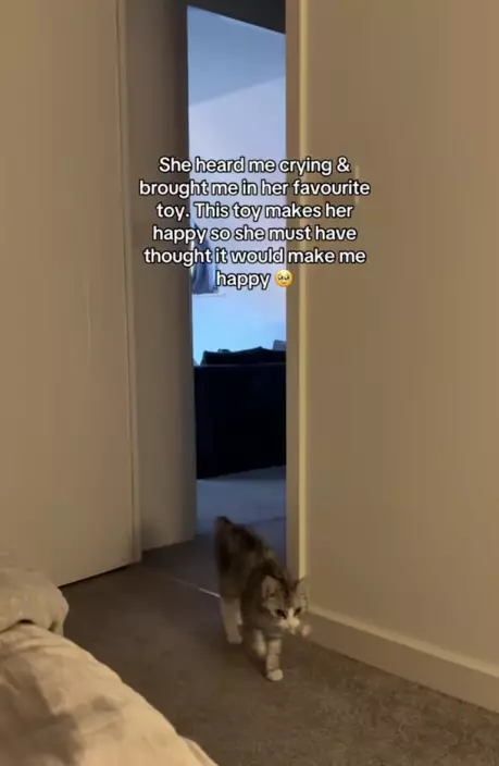影片可見,「Moon」看見飼主在房間哭泣後,竟主動叼來一根最愛的逗貓棒,靜靜放在床前並仰頭望著她,似乎在安慰她,「不要再哭了。」實際上,這根逗貓棒其實是「Moon」最喜歡的玩具,牠可能認為這個玩具能讓自己開心,或許也能幫助飼主開心起來。
