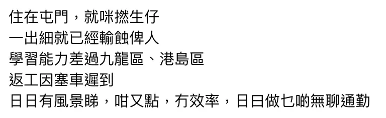 該網民在帖中直言住在該區「唔好生小朋友」,指小朋友會「輸在起跑線」,更稱屯門區居民「學習能力差過九龍區、港島區」;至於打工方面,帖主則抱怨屯門經常塞車導致返工遲到,即使區內有靚景亦無用,坦言「日日有風景睇,咁又點,冇效率,日日做乜啲無聊通勤」。