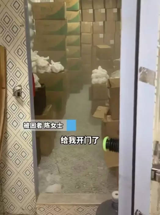 女子受困冷庫逾20分鐘,獲外賣員路過及時解救得以脫困。影片截圖
