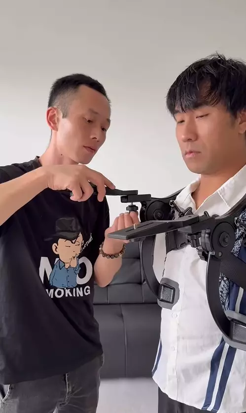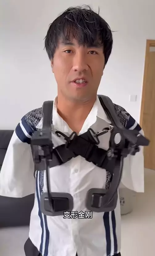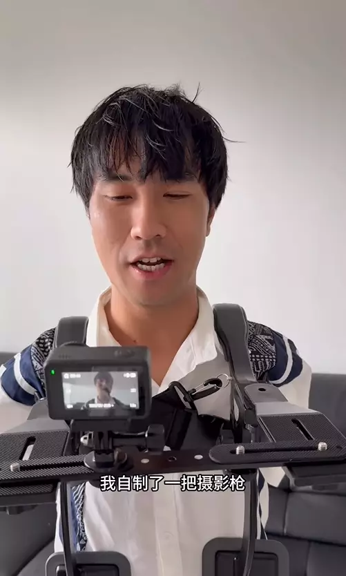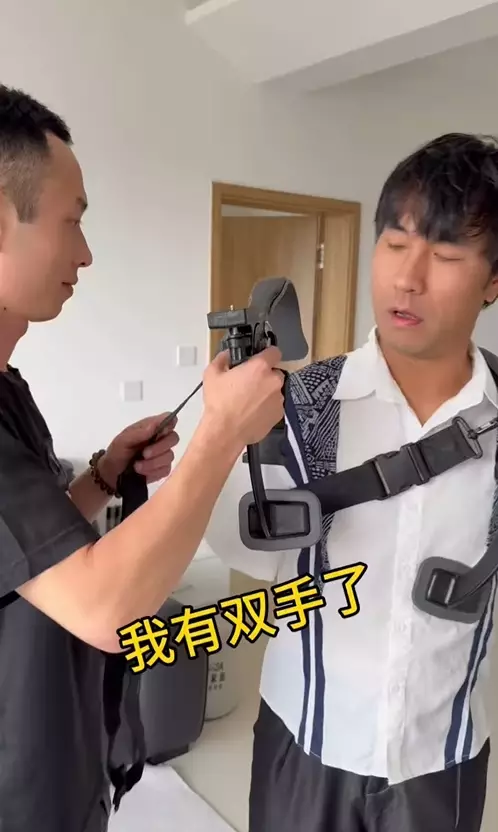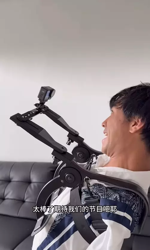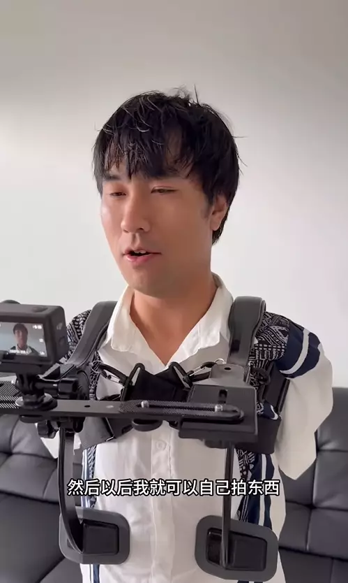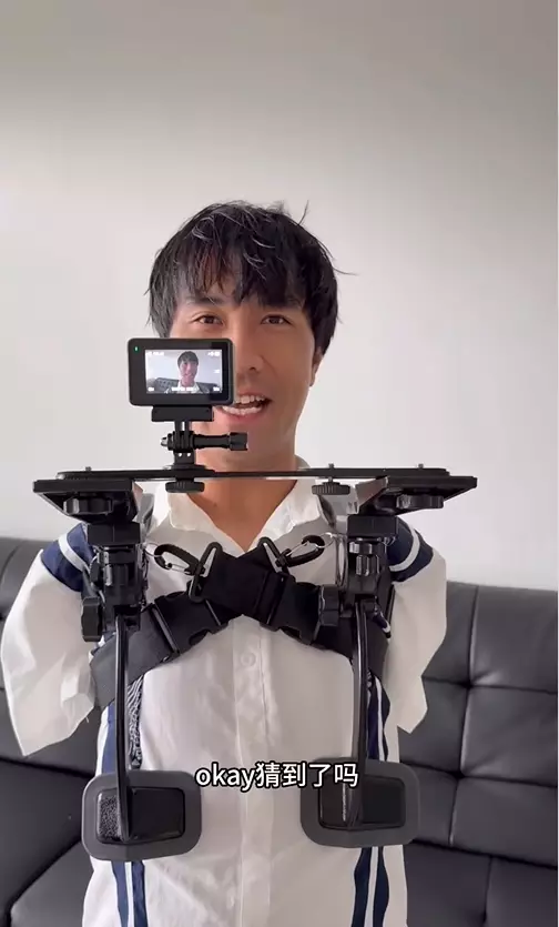 不過,最近他卻在社交平台驚喜宣布,自己終於「有雙手了」!畫面中,他展示了一個從肩部延伸到胸口的鋼鐵支架,原來這並非義肢,而是他特製的「機械手」,用來固定攝影器材。這樣一來,他終於能夠實現「自己拍自己」的夢想。