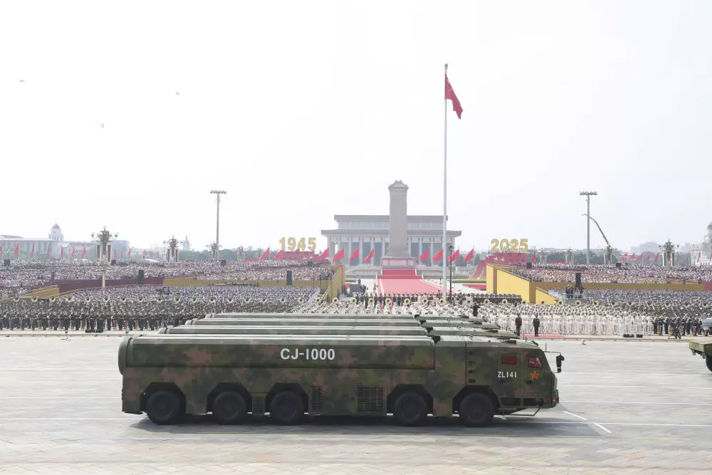「九三閱兵」核導彈第一方隊震撼登場。「驚雷-1」空基遠程導彈、「巨浪-3」潛射洲際導彈、「東風-61」陸基洲際導彈、「東風-31」新型陸基洲際導彈受閱,首次集中展示解放軍陸、海、空基「三位一體」戰略核力量。