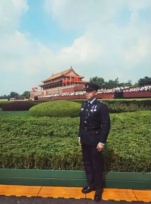 香港警務處處長周一鳴亦與一行15人的警隊代表團出席紀念活動,觀看閱兵。小虎Sir微博圖片