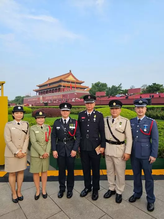 中國人民抗日戰爭暨世界反法西斯戰爭勝利80周年紀念大會,星期三(9月3日)在北京天安門廣場舉行,行政長官李家超率領約360名由各界人士組成的代表團參與活動,其中香港警務處處長周一鳴亦與一行15人的警隊代表團出席,包括在2019年黑暴期間被暴徒襲擊受傷的警員「小虎Sir」梁鎮賢。
