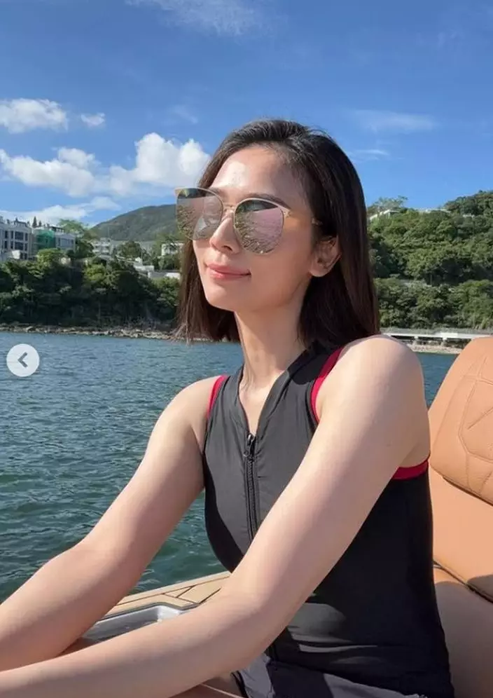 她留言:「今日份 Checklist:接放學,搞掂補習班,做完公司嘢 ,見個太陽咁靚,即刻衝出海!最歡喜是發現6年前件泳衣仲啱身,今日開心指數爆燈!舊衫勝利。