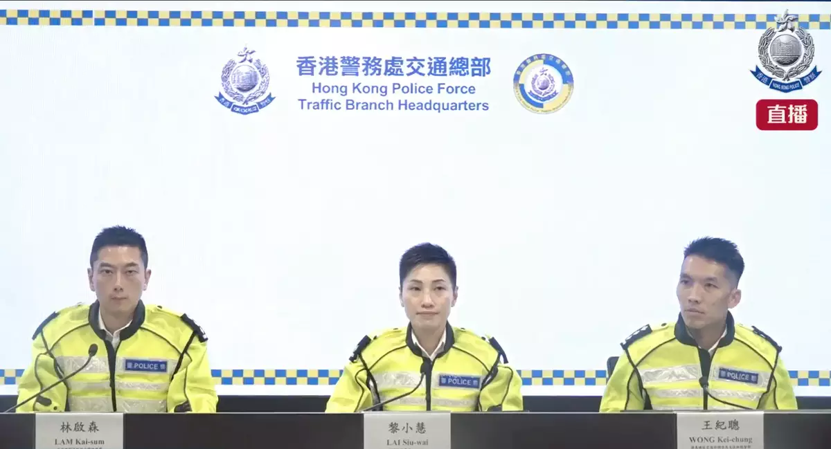 警察交通總部警司黎小慧(中)、道路安全課總督察林啟森(左)及港島總區交通部調查及支援組總督察王紀聰(右)會見傳媒。香港警察FB