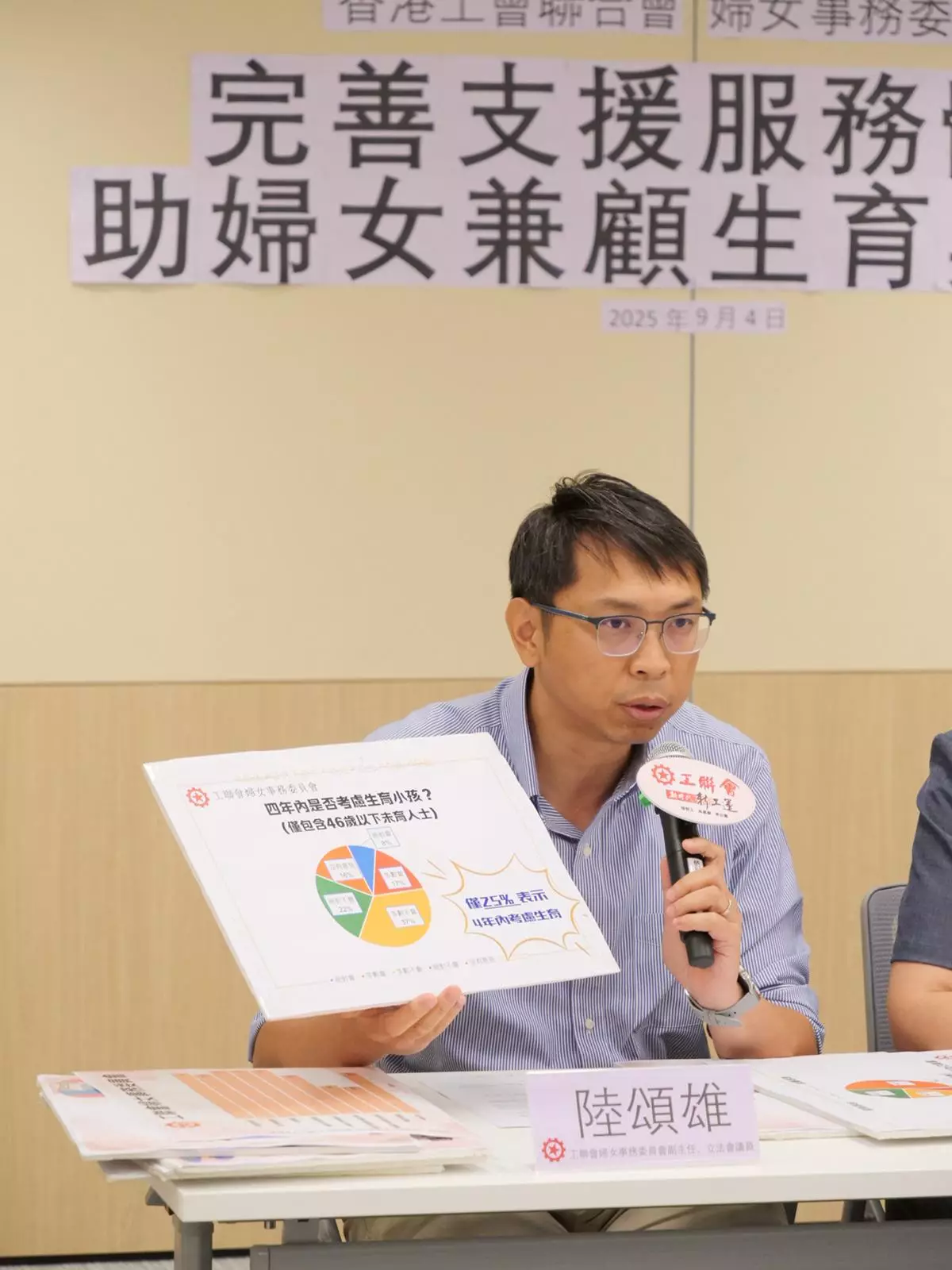 工聯會婦女事務委員會在6月至8月,就生育與工作進行調查,成功以問卷訪問315名46歲以下的受訪者。調查顯示78.8%受訪者將「住屋問題」視為影響生育決定的關鍵因素,其中近六成表示住房條件會對生育決定產生「極大影響」,亦分別有79.9%和77.8%的受訪者將養育子女帶來的經濟壓力與時間成本,列為阻礙生育的主要因素。另外有大約67%的受訪者表示,夫妻雙方事業發展是生育抉擇的重要原因。