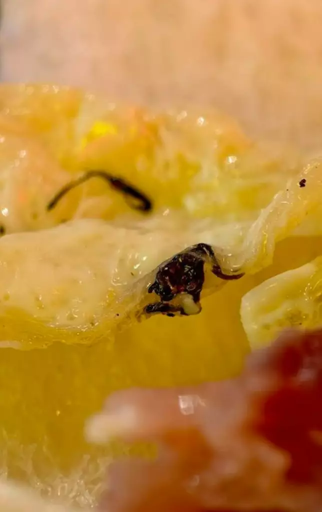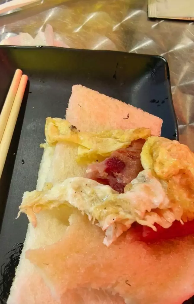 該名網友在Threads撰文分享自己的中伏經歷,他指自己當日在涉事串燒店點了餐蛋治,享用到一半後,赫然發現雞蛋內混有兩隻已分散的昆蟲腳及昆蟲身體殘骸,畫面令人毛骨悚然!事主頓時感到肚子裡一陣翻江倒海,惡心到頭皮發麻,並立即向串燒店店員投訴。