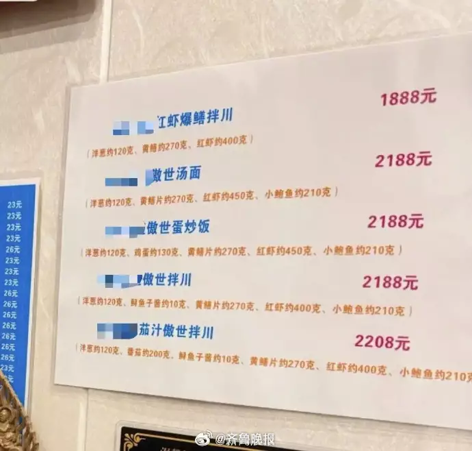 該店於8月底推出兩款高價麵食,其中「茄汁傲世拌川」定價2208元人民幣,食材包含鱘魚子醬、黃鱔片、紅蝦及小鮑魚等高檔配料。店主吳先生強調對自家手藝有信心,稱新品上線半個月已售出十餘碗,甚至有顧客專程托人將麵帶回上海。