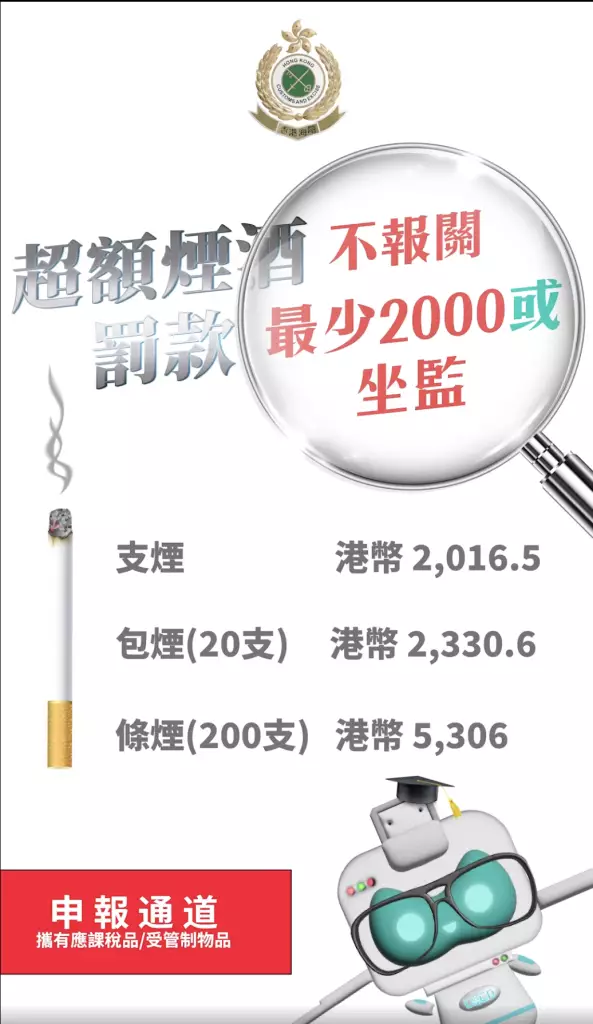 海關早前曝光一張「天價罰款」,原來有人因攜帶超額煙酒入境本港未有報關,遭罰稅款5倍及2000港幣,最終要支付4.7萬港幣罰款。而來到星期五,海關再在社交平台撰文,提醒大家,若帶超額煙酒入境香港,記得去紅通道向香港海關申報,「超額煙酒不報關,罰款最少2000元或坐監。」