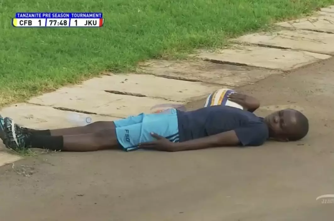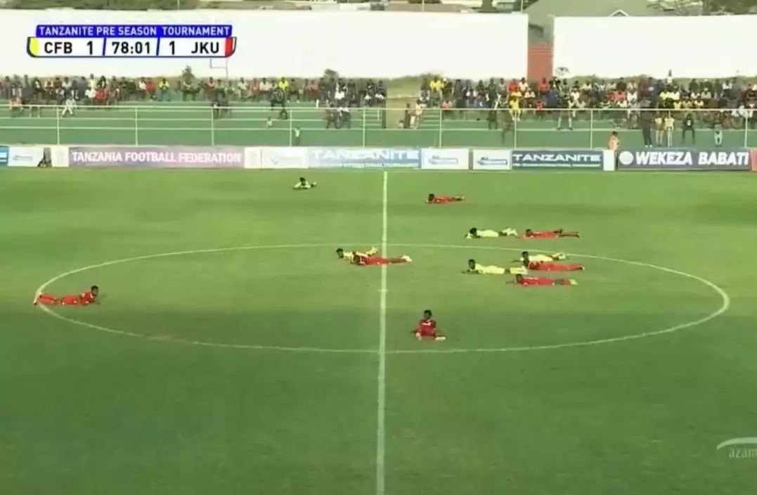 綜合外媒報道,坦桑尼亞巴巴蒂(Babati)的奎瓦拉體育場(Kwaraa Stadium)日前舉行一場季前熱身賽,對陣雙方為阿布賈城足球會(City FC Abuja)與JKU足球會(JKU FC)。然而,場上所有球員及裁判於比賽期間突然集體伏地,做出掩護避難姿勢,場面相當離奇。