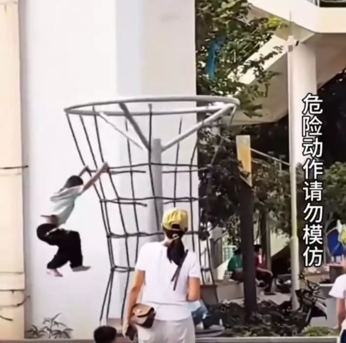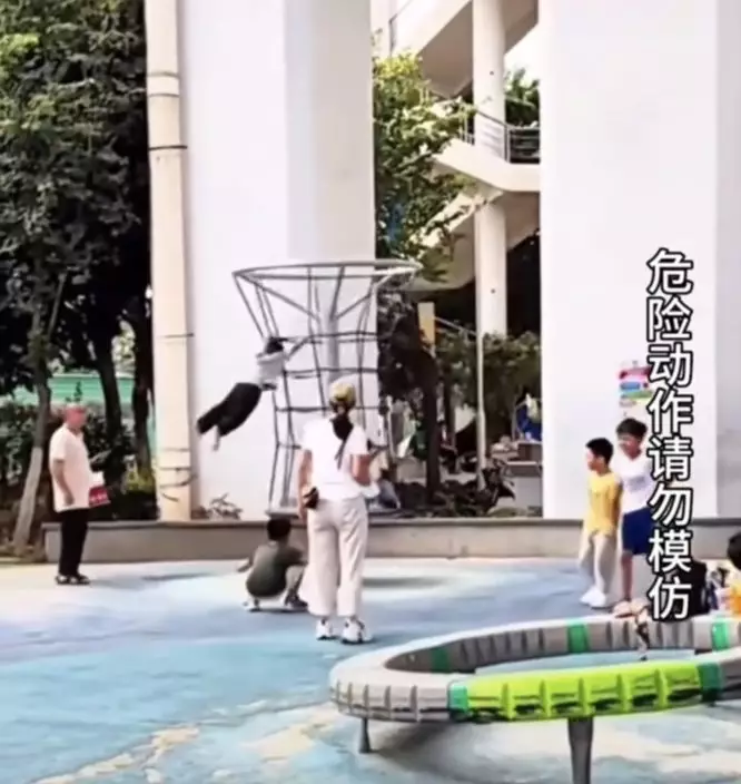 現場2名成年人見狀感到錯愕,但卻未有上前協助。所幸一旁圍觀的小男童見狀果斷上前減速,成功令懸空的男孩逐漸回到設施上。